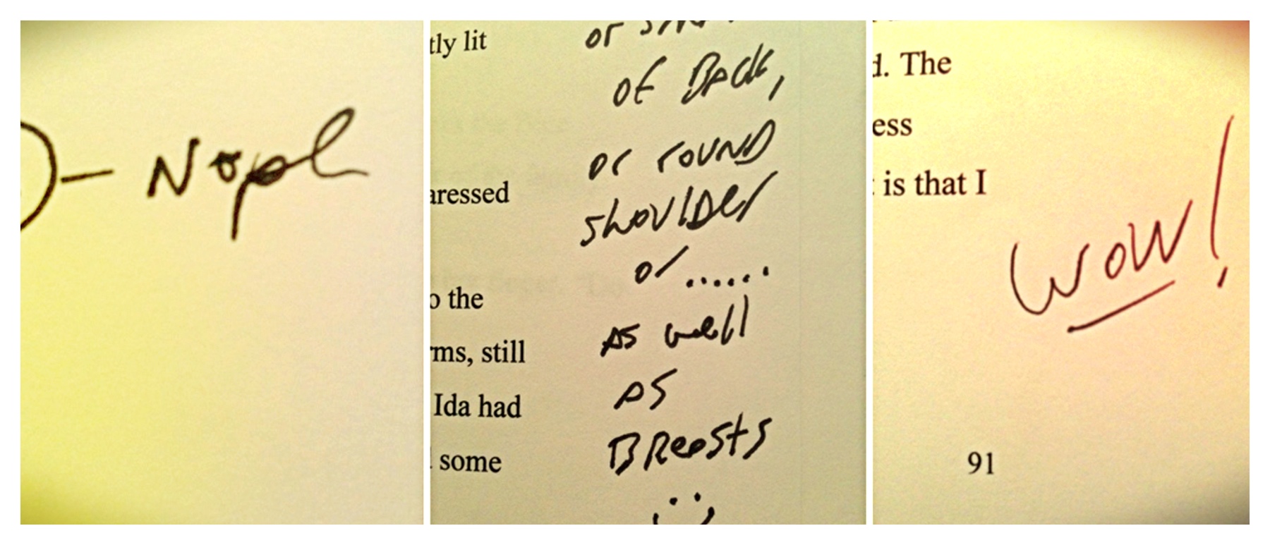 In my case, I scored some feedback as clear as “nope,” “WOW!” and then this other, slightly longer note letting me know that there are other parts of the female anatomy that deserve attention besides breasts. Who knew? It seems that other sexy parts on a woman’s body include a delicate shoulder, the small of the back, or the curve of the hips. Now, in my defense, I’m pretty sure I rave about all of those luscious parts as well. But it seems not quite as often as I sing the praises of ample breasts.