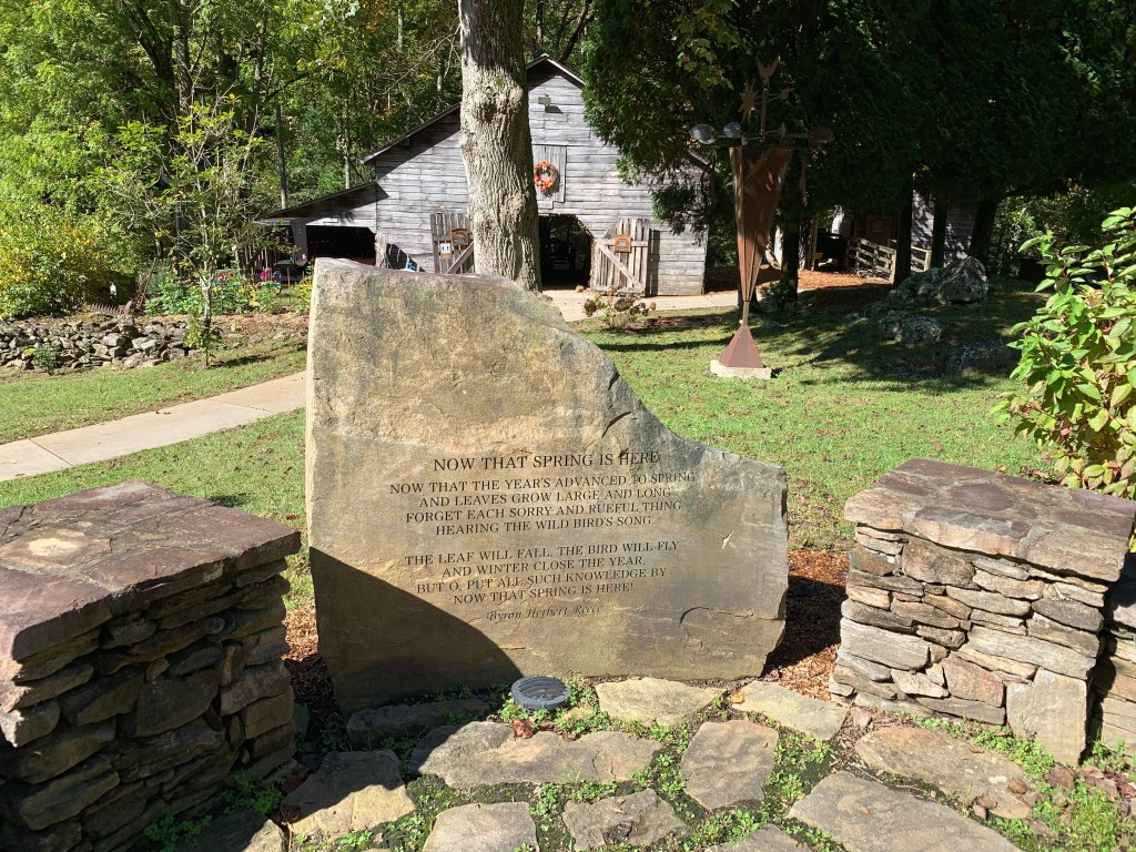 Yesterday, during lunch, I stopped by an historical site I’ve driven by many times. During previous trips there never seemed to be spare moments to visit the farm and cultural center honoring the poet Byron Herbert Reece. The place is small and rustic, featuring a barn, old farm equipment, among other ephemera, but the most engaging part of the landscape for me was the large stones where excerpts from his poems have been carved. I slowly stood and read each one, appreciating Reece’s quiet observations of both nature and feeling. It’s obvious from his words that he lived outdoors.